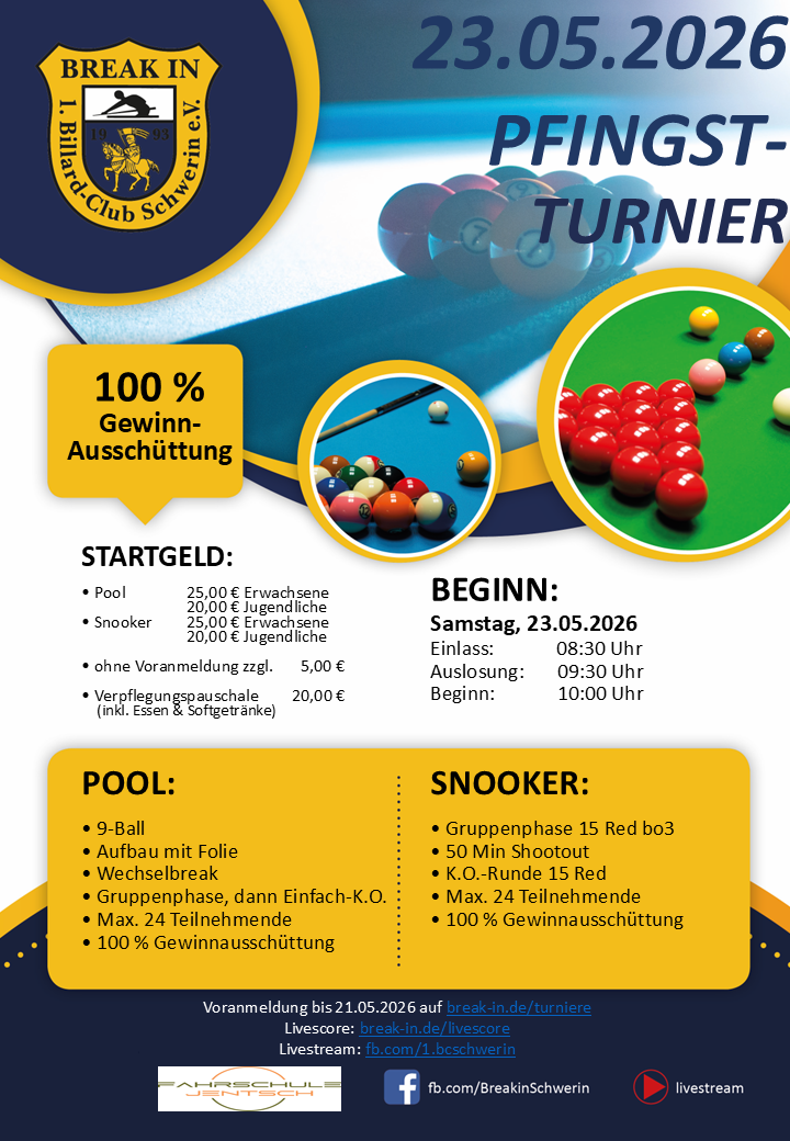 Unsere modernen und gepflegten Vereinsräumlichkeiten bieten ideale Möglichkeiten, um die Billardarten Pool, Snooker und Karambol auf hochwertigem Spielmaterial einmal selbst auszuprobieren. Die professionellen Tische - 4x Poolbillard (9 Fuß), 4x Snooker (12 Fuß) und 1x Karambol (Halb Match) - werden